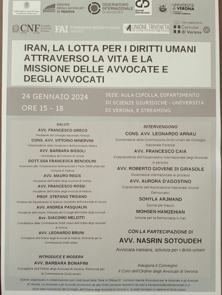 Cari Colleghi, pubblichiamo la locandina dell’importante evento formativo “Iran, la lotta per i diritti umani attraverso la vita e la missione delle avvocate e degli avvocati“, che si terrà mercoledì 24 gennaio alle ore 15, in occasione della Giornata internazionale degli Avvocati in pericolo, ideata allo scopo di sensibilizzare l’opinione pubblica sulle minacce, sulle violenze […] Leggi news